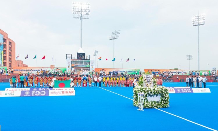 A special tribute was paid to the 'Wizard of Hockey' by Fumio Ogura, President, Asian Hockey Federation; Shri Raveendran Sankaran, IPS, DG-cum-CEO, BSSA; Jitendra Rana, IPS, Inspector General of Police, Patna Zone; Dilip Kumar Tirkey, President, Hockey India; Bhola Nath Singh, Vice President, Asian Hockey Federation & Secretary General, Hockey India; Sekar J Manoharan, Treasurer, Hockey India & President, Hockey Unit of Tamil Nadu; and Commander R.K. Srivastava, Director General, Hockey India during the pre-match protocol of the opening game of the ongoing Hero Asia Cup Rajgir, Bihar 2025, featuring Malaysia and Bangladesh.