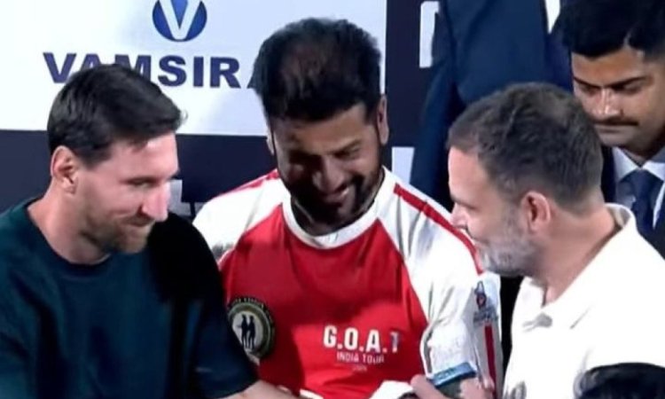 "Viva Football With the GOAT @leomessi," wrote Gandhi in his message, which was accompanied by a video showing visuals from his meeting with the Argentine superstar. The video shows Gandhi posing for pictures with Messi, walking with the former Barcelona and PSG star, and talking to him as Messi waved to his fans.